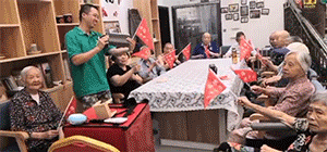 活動現(xiàn)場,各點的爺爺奶奶們引吭高歌,揮舞著小紅旗,唱著《歌唱祖國》,互相揮手致意說著節(jié)日快樂,他們雖然不在一個養(yǎng)老點上生活,但仿佛都像是熟悉的朋友,我想,這就是連鎖品牌的魅力吧~