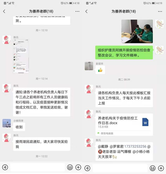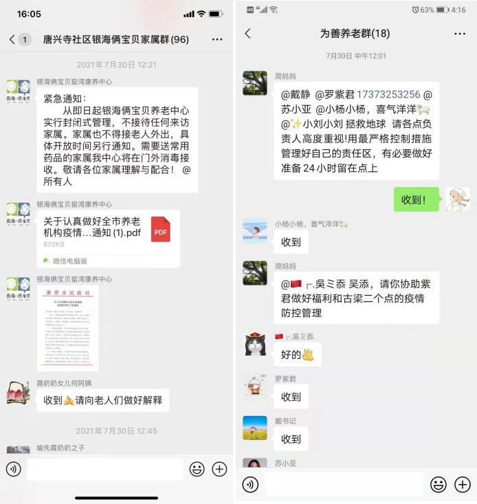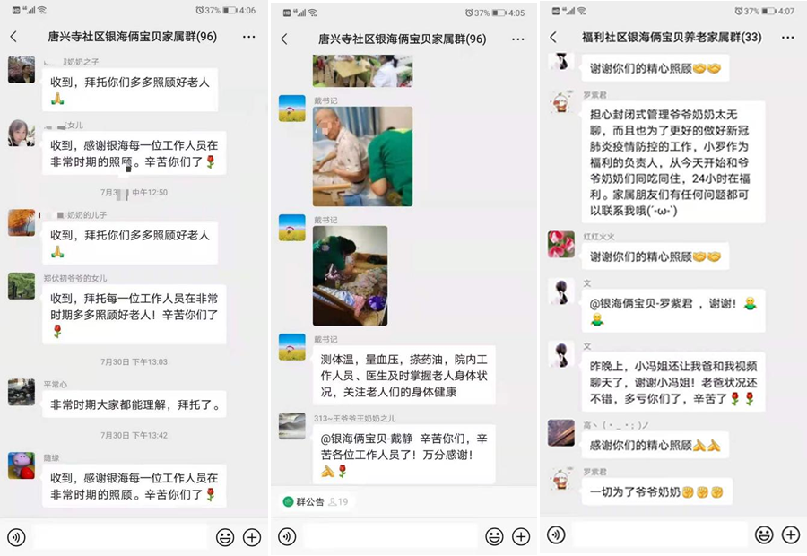 院內(nèi)外設(shè)置物資接受消毒區(qū)、隔離區(qū),公司統(tǒng)一運送所有物資,每日兩消兩查,即時更新2碼1記錄。每位銀海人在這關(guān)鍵的時刻絕不掉鏈子,積極組織老人與家屬視頻連線,緩解老人及家屬的焦慮,組織爺爺奶奶在院內(nèi)開展康樂活動,豐富日常生活。