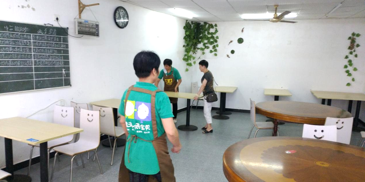 (圖為餐廳裝修搞好衛(wèi)生后,工作人員把桌椅擺放回食堂)