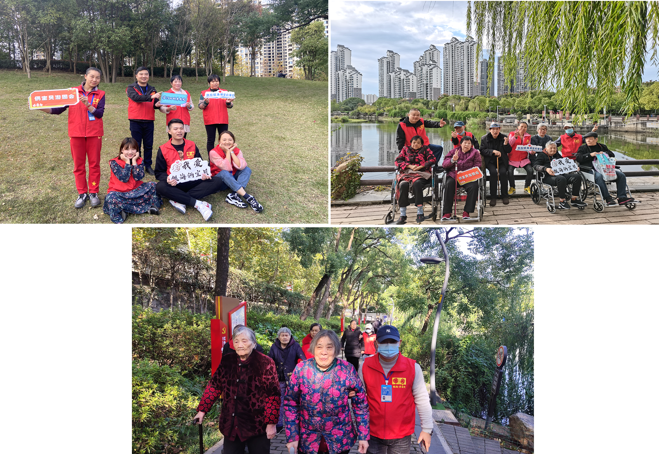 11月的第二周,伴著溫暖的陽(yáng)光,跟隨秋天的腳步,一路歡歌笑語(yǔ),一路幸福蕩漾,在一群身著“倆寶貝”紅色馬甲工作人員陪伴下的長(zhǎng)者們其樂(lè)融融的來(lái)到了各大公園。