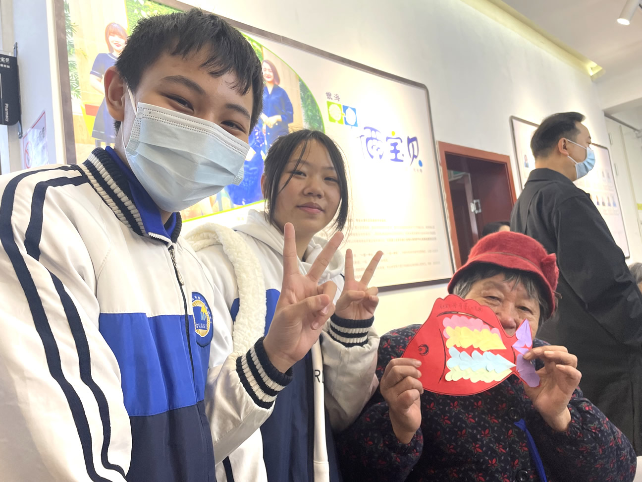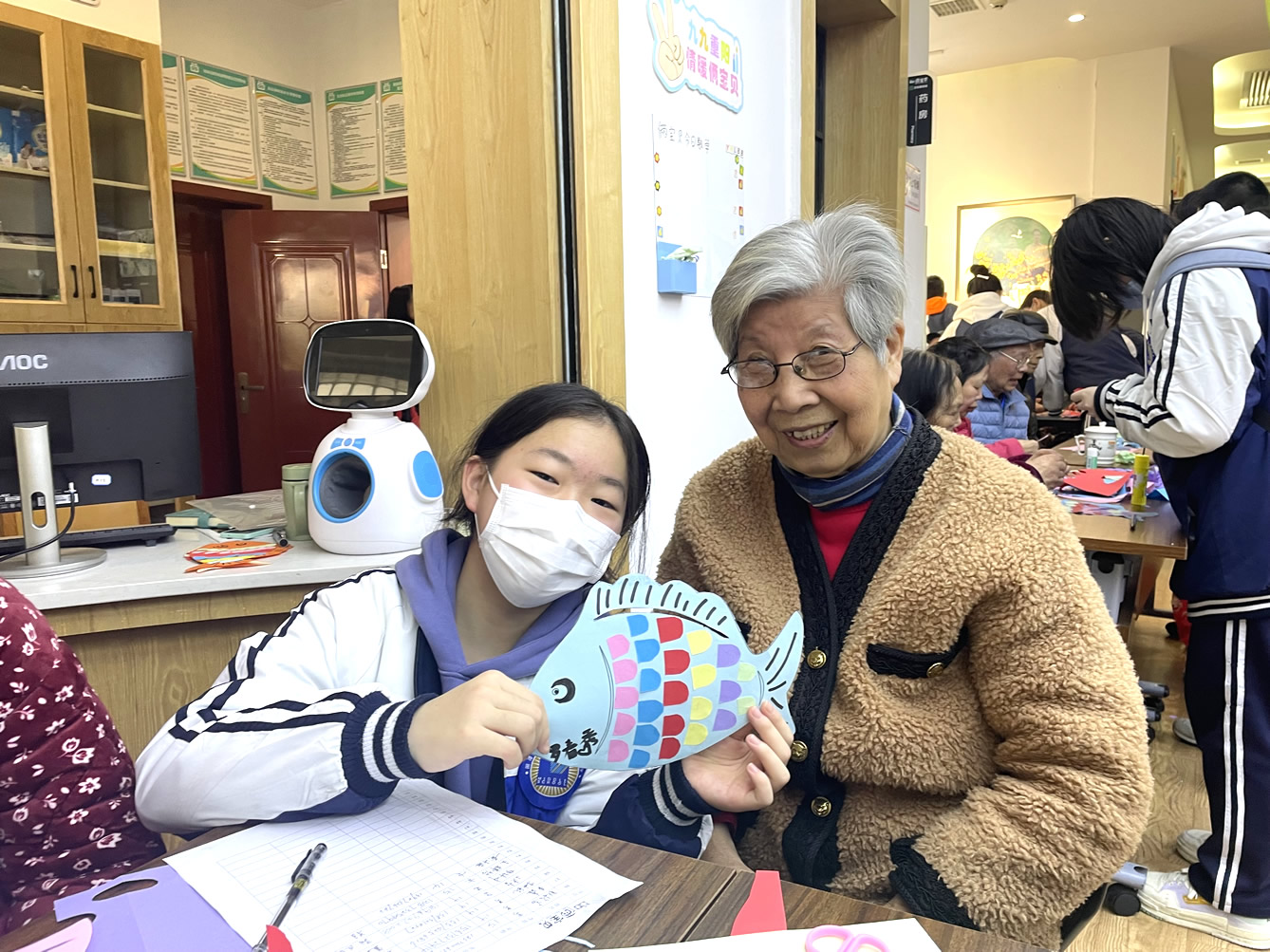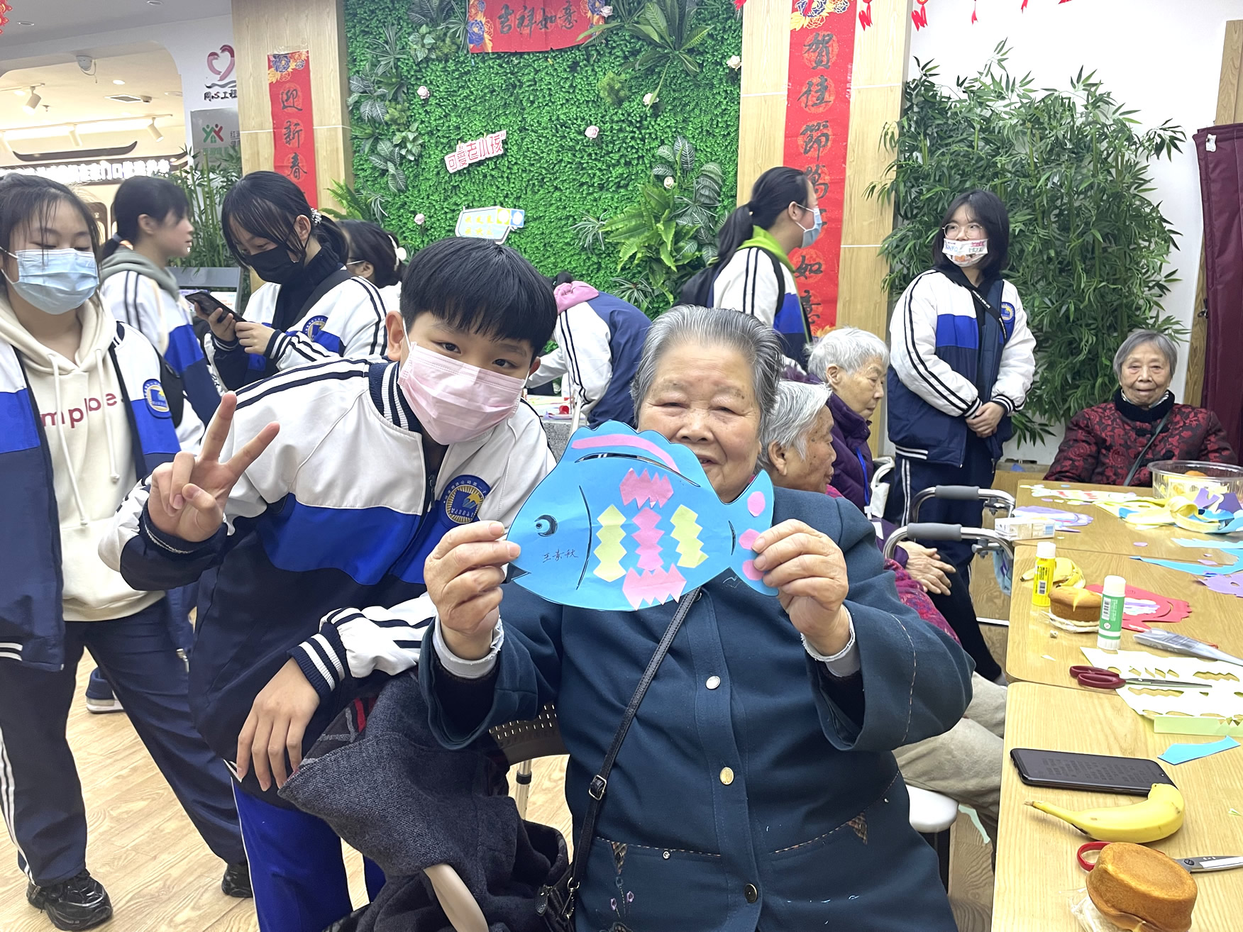 “爺爺,您喜歡這個顏色是嗎?下面我?guī)椭黄鸢阉舫鰜砗脝??”、“奶奶,您平常都有些什么愛好呀,可以跟我們說說您的故事嗎?”……只見同學(xué)們有的蹲坐在老人旁邊,有的則是伏耳于他們面前,耐心認真地和爺爺奶奶們進行交流,其他的人則是分工協(xié)作,完成“魚”的其他部位制作。不多久,一條條色彩斑斕,創(chuàng)意十足的“魚”就做好啦!爺爺奶奶們拿著完成的作品分別和自己的“小伙伴”們合影留念,再次感謝他們的到來!