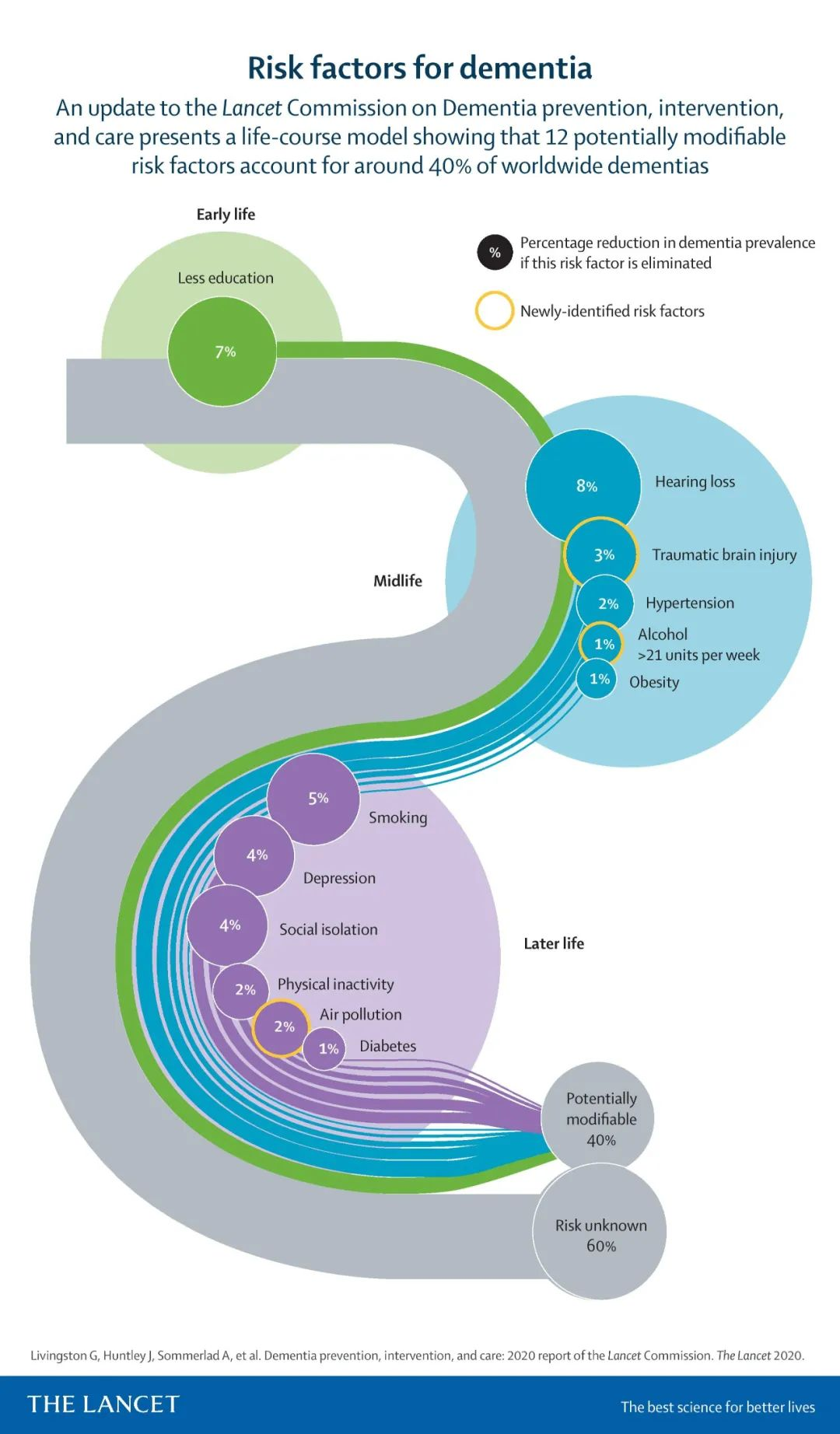 2020年阿爾茨海默病協(xié)會(huì)國際會(huì)議(AAIC)上,《柳葉刀》雜志委員會(huì)發(fā)表了最新的認(rèn)知癥預(yù)防措施,提出改變12個(gè)危險(xiǎn)因素,可預(yù)防或延遲多達(dá)40%的認(rèn)知癥病例。其中,包括維持聽力、保持腿部健康都上榜。